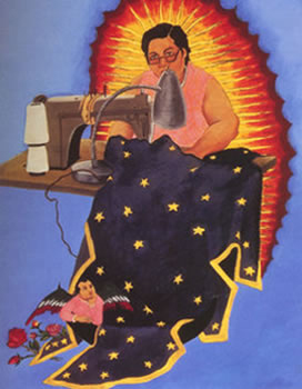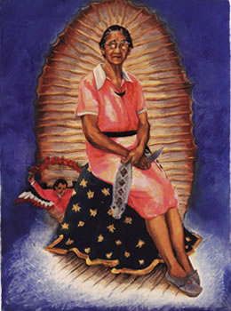 Yolanda Lopez has received the majority of her fame through the creation of her Guadalupe series. This groundbreaking series has transformed the way in which the iconic image of the Virgin of Guadalupe is viewed into a much more personal and political ideal. Lopez claims that in creating the Portrait of the Artist as the Virgin of Guadalupe she questioned this common icon of the ideal woman in the Chicano culture. The goal of Lopez was to demonstrate and consider the new types of role models Chicanas need and not simply adopt anything just because it is Mexican. Yolanda stated that by doing these portraits of her mother, grandmother, and herself she wanted to draw attention and pay homage to working class women, old women, middle-aged over weight women, young, and self assertive women. By naming each drawing individually Lopez emphasizes the uniqueness of each woman and accentuates the society that allows women of color to go unnoticed. In the Portrait of the Artist as the Virgin of Guadalupe, Yolanda illustrates the strength and the power by the muscular legs and the long strides as well as the leap she has taking from the crescent moon. Through this long leap Lopez demonstrates that Chicanas are free from the oppressive social stigmas that limit women’s form of expression. In Margaret F. Stewart: Our Lady of Guadalupe, Lopez depicts her mother at work but proposes a new type of beauty. This new beauty is not the typical beauty that is depicted by others as the slender body type, white, young, and glamorous but as the older an fuller woman hard at work. Lastly in Guadalupe: Victoria F. Franco, Lopez illustrates her grandmother as a sad but strong old woman. In each portrait Lopez incorporates a serpent but the serpent in her grandmother’s portrait has been skinned and the grandmother holds the serpent skin in her left hand and the knife that was used in on her right hand. Lopez states “ She is holding the knife herself, because she’s no longer struggling with life and sexuality. She has her own power.” According to Dr. Davalos (author of Yolanda Lopez) the first two portraits represent lived realities of Chicana women and the last portrait address death. |