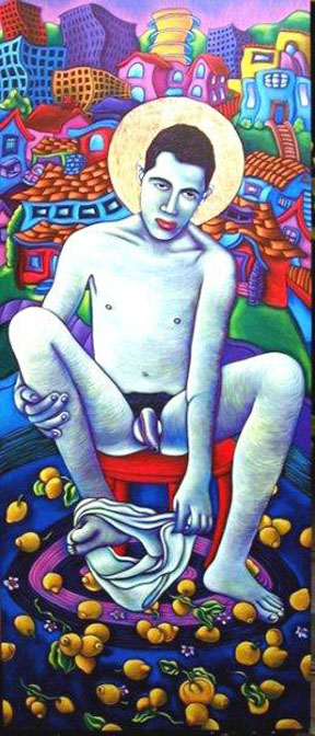 This painting is titled San Limon which translates to Saint Lemon. His work mixes religious iconography with gay subjects, blending homoeroticism and spirituality. His vivid, sensuous paintings burst with color and always seem to have a touch of surrealism in each piece. He features the people, neighborhoods, landscapes, cityscapes, dogs and flowers that he sees in his daily life. In this particular painting, I really liked the urban background (buildings and roads) fused with nature (the lemons scattered across the floor). This naked man affirms De Carlo's depictions of male eroticism and sensuality of the male body as well as the holiness of homosexuality. In an interview with Kittredge Cherry, an art historian and author, Tony says he grew up with the imagery of saints in cathedrals, statues, paintings and stained glass windows. He first started painting saints as a response to the Catholic Church’s tirades and attacks on, and demonization of, gay people. He believes the saints are all made-up. So he began adding his own saints to the list, some sarcastic, some comical, but all of them with the same number of videotaped miracles as the "real ones": 0. This one is San Limon which is just a play off of the lemons on the floor and the naked man as the subject. While the name of the painting has no significant meaning (like his other paintings, just to name a few: San Perro, The Patron Saint of Chain-Smokers, San Labios, Saint Aaron the Surfer, The Patron Saint Protector Against Aids, etc.), the content represents the holiness of homosexuality, representations of the male body, and sensuality.