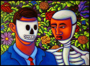 This painting is titled Destiny Masks. It is about the painful hardships homosexuals endure in their lives. He uses very colorful and beautiful flowers in the background to contrast the image of death. Tony likes to depict not only the glorification and holiness of the queer community, but also the suffering and sorrow they face. People who identify as queer often face discrimination, violence, and oppression on a daily basis. The masks of both the man and the skeleton show how gay men are “dead men” because there are many dangers that come with their identity. The living man with the death mask and the dead man with the mask of the man who is alive represents this message. The skeleton also connects to De Carlo’s famous theme of Dia de los Muertos in his paintings. He likes to play around with the idea of death by placing skeletons of men in homosexual scenes as well as religious and domestic scenes. Although he mostly tends to focus on the love and bond between two men, this painting focuses on the consequences homosexual people receive as a result of the hatred and bigotry of others.