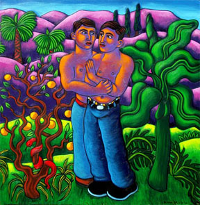 This painting is titled Adam And Yves. It is a masculine and homosexual play off the biblical characters Adam and Eve. It represents male sensuality and the freedom to be openly gay without being subjected to discrimination or violence. Tony De Carlo's work is a testament to the gay world and a vehicle of social protest which calls for freedom and acceptance of the gay community. Anyone viewing this piece can notice the immediate similarities to the biblical story such as the snake twisted around the tree as well as the fruits near it. This can be compared to the story of the “forbidden fruit” the snake gave to Eve to tempt her. The fruits in the tree look similar to the lemons in San Limon as well as the fruits in other paintings by De Carlo which demonsrates his passion to incorporate nature and love. He does this because it shows how homosexuality is something natural. De Carlo uses two men embracing each other to show a new and modern take on love, sensuality, and homosexuality both through an artistic and religious perspective. His Adam and Steve series, now number 20+, were initially a response to the argument "God made Adam and Eve, not Adam and Steve" that he heard over and over from self-professed Christians. He says gay people and their relationships are no less valid or worthy than anyone else's. He continues to add to this series a painting or two per year, often in domestic settings, with titles like Adam and Steve At Home and Adam and Yves.