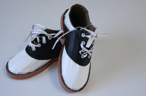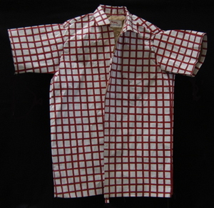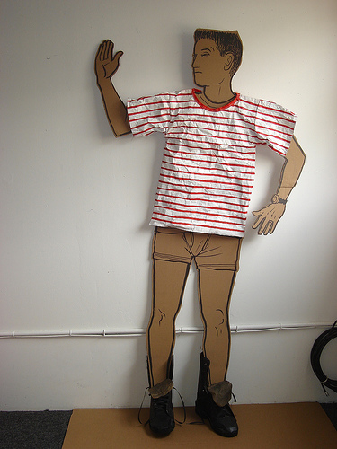 In 2006, Phranc collaborated with cartoonist and fellow paper lover Alison Bechdel in a joint show entitled “Paper Play” at Pine Street Art Works in Vermont. The show included life-sized paper dolls created by Bechdel which were dressed in Phranc’s paper clothing. Her love of mid-century kitsch shines through in this show with pieces ranging from black and white saddle shoes to this red and white striped t-shirt, which is displayed here on the life-sized paper doll version of Phranc. During the time leading up to the exhibition, Phranc created a podcast in which she explains how she creates her “fabric” for her paper clothing and gives us a glimpse at a work in progress—the now infamous black and white saddle shoes. Her process for creating the “fabric” is a labor intensive one that involves hand-painting large rolls of kraft paper, in this case with red and white stripes, and then cutting out a pattern and sewing it together on her grandmother’s old sewing machine. Like her music, Phranc’s artwork reflects her interests and her insights on everyday life, and as with much of her music, she makes her commentary with a sense of humor.