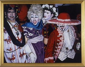 Joey Terrill's Jeff, Victor, Luiz and George has a festive tone to it as the men in the painting are in inverted costumes with big smiles on their faces or with their mouth wide open in laughter. The Miller beer can is another piece of the scene that adds playfulness to this captured moment of friends at a party. The men in this scene are also breaking down gender roles as they are dressed in women's clothing and makeup. Flowers are usually associated with women but in this scene the men have numerous flowers in their hair along with jewelry hanging from their ears. Jeff is dressed as Frida Kahlo which he specifically chose to dress as for a reason. Frieda Kahlo is one of the most influential avant-garde female artists of Mexico and he is paying homage to her by cross dressing and becoming her which at the same time is crossing the lines of gender roles as well.