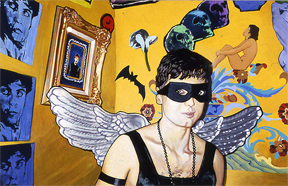 This piece feels very personal as Terrill is in a room surrounded by various fun objects. The bright yellow on the walls of the room gives off a warm and welcoming tone along with his colorful collection of personal images on the wall such as the purple and green skulls, flowers, a bat, paintings, etc. His costume also adds to the light-hearted tone as the young Terrill has angel wings and a domino-like mask. Many of Terrill’s painting revolve around the malleability of the costume as these subjects are given the freedom to become whatever they wish behind the playfulness of make-up and masks.