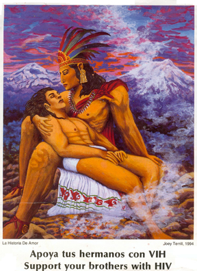 The Aztec legend says that Ixtaccihuatl waited for her lover the warrior Popocapetl until she believed him to die in battle and killed herself. Popcapetl finally arrives but too late and carries her dead body to the top of the volcanoes to try and revive her. Terrill takes this traditional story of love and recreates it to a homosexual story of love replacing the dead female figure with instead a sleeping male figure. By having the male subject in the image sleeping, Terrill invokes a tone of hope rather than a depressing tale of star-crossed lovers. Also by naming it “La Historia de Amor” Terrill is stating that homosexual love has a long history.